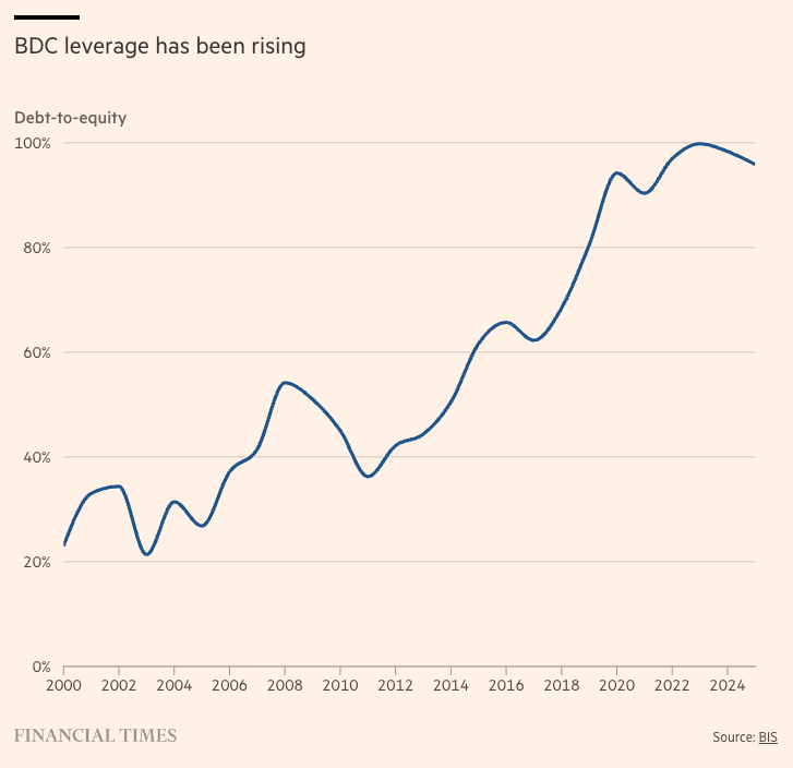 기업 개발 회사(BDC)의 부채 비율 추이 (자료: FT) 사모 신용의 한 형태인 기업 개발 회사의 부채 비율은 금융위기 이후 빠르게 증가했다. 폐쇄형 펀드들의 부채 사용 역시 상장 기업 개발 회사(BDC)와 마찬가지로 증가했을 것으로 추측된다. |