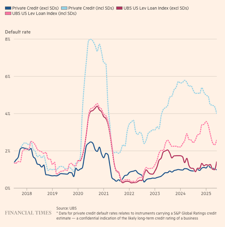 사모 신용의 예상 부도율 추이 (자료: FT) (하늘색 선을 보면) 현물 지급 이자가 포함된 선택적 부도를 포함할 경우 부도율이 크게 치솟는다. |