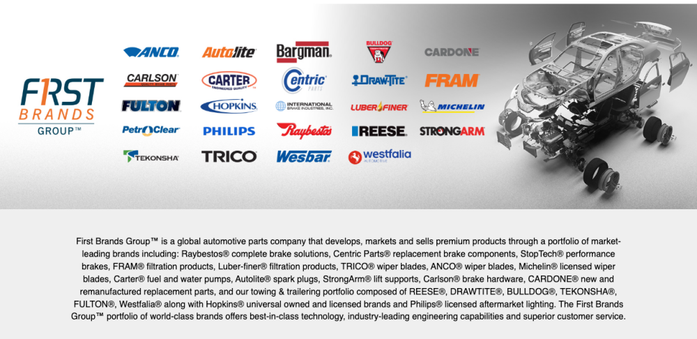 퍼스트 브랜드 그룹은 생소한 기업이지만, 대표적인 자동차 부품 브랜드들의 상품을 라이센싱해 제조하고, 자체 상품도 제작하는 부품사이다. 연간 40억 달러(약 5조 8250억 원)가 넘는 규모의 견실한 회사였다. (이미지: 퍼스트 브랜드 그룹 홈페이지) |