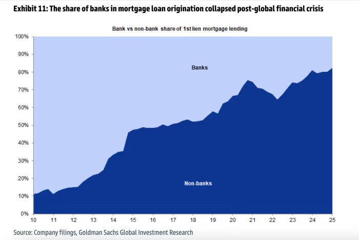 2008년 금융위기 이후 대출이 은행 시스템 밖으로 이동하면서 오히려 시스템 리스크가 감소했다고 골드만삭스는 진단한다. (이미지: 골드만삭스) |