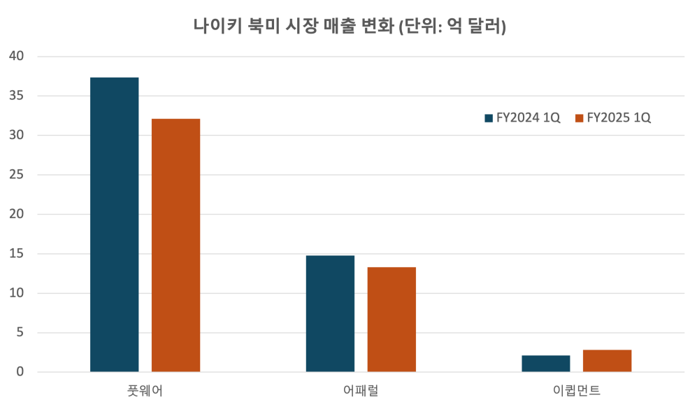 나이키 북미 시장 매출 변화 (데이터: 나이키 FY2025 1Q 실적 보고서) 나이키의 추락은 특히 러닝의 붐이 한국을 비롯한 아시아 시장보다 1~2년은 더 빠르게 왔던 미국 시장에서 두드러집니다. 그리고 이 시장에서 풋웨어의 최근 실적은 전년 대비 14% 하락한 결과로 나타났습니다. 러닝을 비롯한 스니커즈가 얼마나 큰 비중이며, 중요한 카테고리인지 이 표로도 바로 알 수 있죠. 이번 실적에서 가장 눈여겨봐야 할 부분이기도 합니다. |