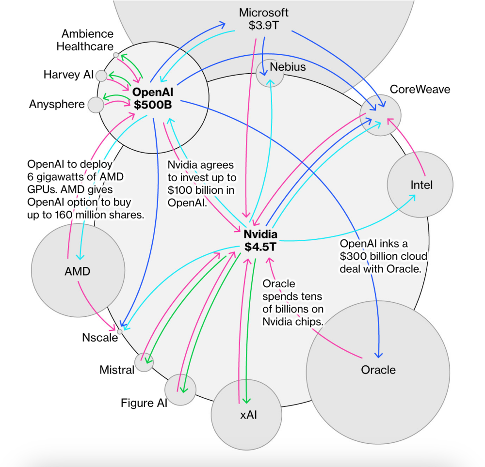 오픈AI와 엔비디아라는 AI 프런트맨들을 중심으로 만들어지는 '순환 금융(Circular Financing)'이 핵심입니다. 오픈AI는 엔비디아의 투자를 받아 엔비디아의 GPU를 사고, 오라클과 데이터센터 건설 계약을 체결하고, 이 돈으로 또 다른 AI 스타트업에 투자도 합니다.
