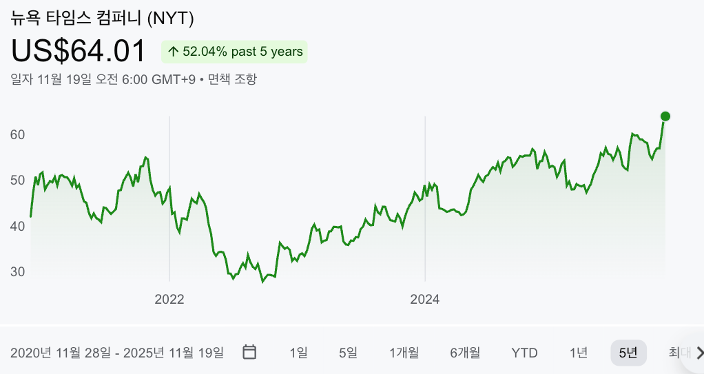 뉴욕타임스 주가가 최근에 다시 시총 100억 달러(약 14조 6570억 원)를 넘겼습니다. 3분기 실적을 발표하고 난 시점이죠. 그리고 최근 AI 버블론이 대두되면서 시장이 흔들리는 와중에요.