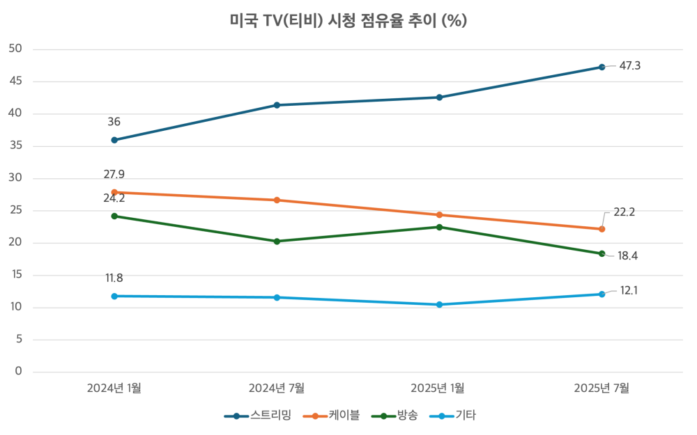 완전 경쟁 시장이 보여주는 원리이기도 합니다. 이렇게 경쟁의 원리가 작동한 시장은 기존의 시장인 케이블 시대의 끝을 알렸습니다. 그리고 이 거스를 수 없는 흐름은 올해를 기점으로 더 쎄게 당겨졌고, 진정 한 시대의 종언을 알리고 있습니다.