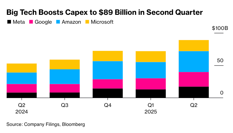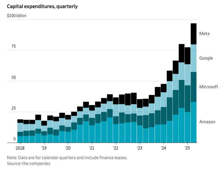 블룸버그는 빅테크 중 현재 AI 데이터 센터에 가장 크게 투자를 하고 있는 4개 기업인 메타, 구글, 아마존, 마이크로소프트의 자본지출이 지난 분기에만 890억 달러(약 124조 원)에 이르렀음을 짚었습니다. 올해 이 4개 기업 자본지출의 총합은 3440억 달러(약 478조 원) 이상이 될 것으로 보이며, 대부분이 데이터 센터에 들어갈 것이라고 예상하고 있죠.