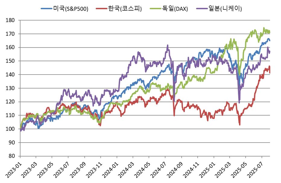 미국, 한국, 독일, 일본 주가지수 추이 (데이터: 블룸버그) 2023년 1월 초 주가지수를 100으로 재조정했다. 주요국 증시는 4월 저점 이후 가파르게 반등하여 전고점을 수준에 도달했거나, 고점을 돌파했다. |