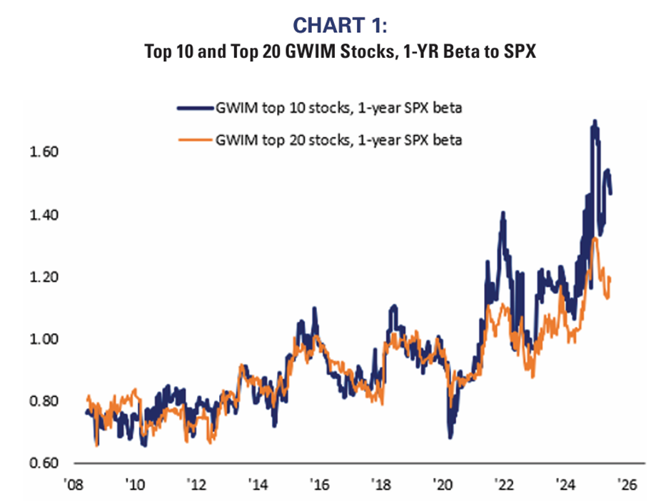 개인 투자자 보유 상위 10위와 20위 종목의 S&P500 대비 1년 베타 추이 (자료: Richard Bernstein Advisors) |